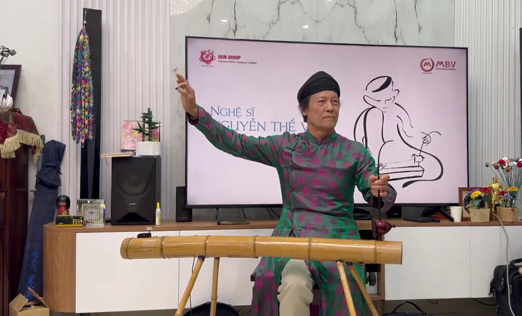 Nghệ sĩ đàn bầu Thế Vinh biểu diễn trong buổi giao lưu; đàn bầu, nhạc cụ truyền thống đặc sắc của Việt Nam, góp phần lan tỏa chiều sâu văn hóa và tinh thần dân tộc (Ảnh: GKM).